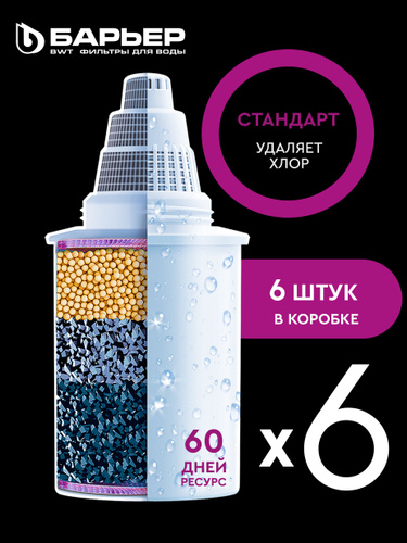 Фильтр для воды БАРЬЕР, комплект кассет для фильтра-кувшина, модель Стандарт, усиленная защита от хлора, улучшает вкус, ресурс 350 л, 6 шт