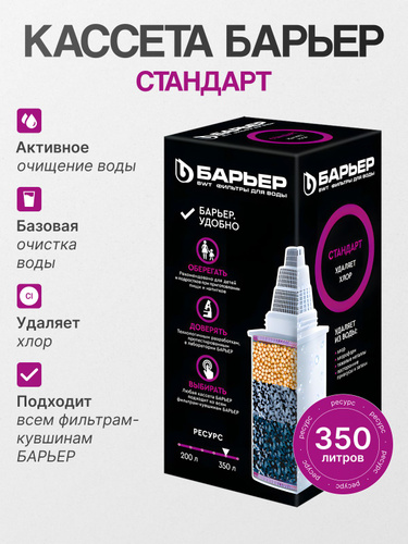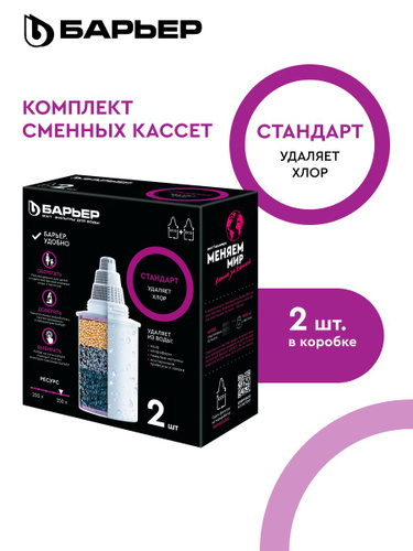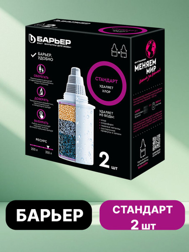 Фильтр для воды, комплект кассет для фильтра-кувшина, БАРЬЕР, модель Стандарт, усиленная защита от хлора, улучшает вкус, ресурс 350 л, 2 шт