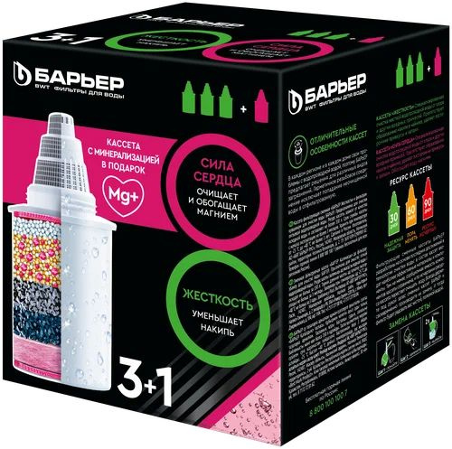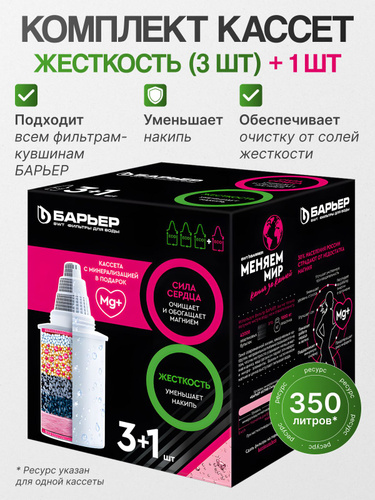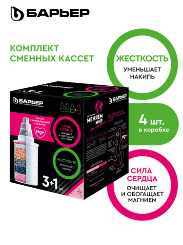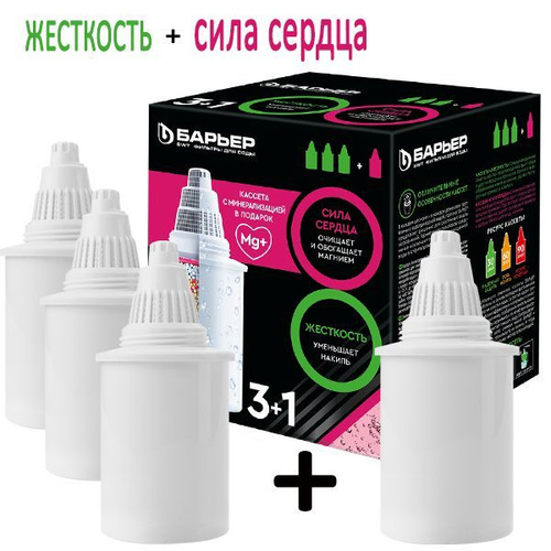 БАРЬЕР Жесткость и Актив Сила Сердца, комплект кассет для фильтров-кувшинов 3+1шт, защищает от накипи и обогащает магнием