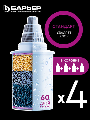 Фильтр для воды БАРЬЕР, комплект кассет для фильтра-кувшина, модель Стандарт, усиленная защита от хлора, улучшает вкус, ресурс 350 л, 4 шт