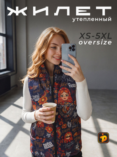 Жилет утепленный Дикий шоп оверсайз с принтом Матрешка безрукавка
