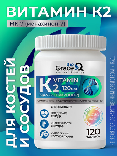 Витамин Д3 2000 IU + К2 для иммунитета, костей, связок GraceBioQ, 120 таблеток