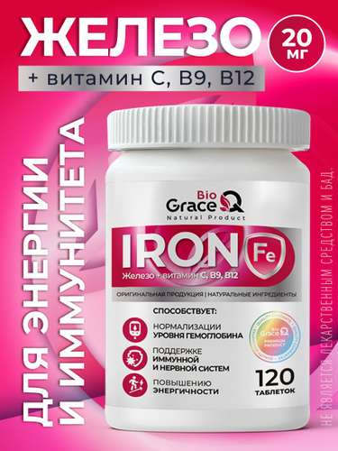 Железо хелат с витамином С, В9, В12 для иммунитета, гемоглобина, 20 мг, 120 таблеток