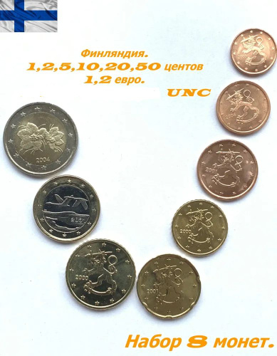 Финляндия. 1,2,5,10,20,50 центов 1,2 евро. 1999-2002 год. Набор 8 монет. UNC