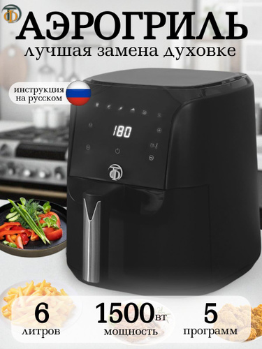 Аэрогриль электрический, 1500вт, 6л, мультипечь 5 программ, TF-2 аэрофритюрница с чашей и решеткой, черный