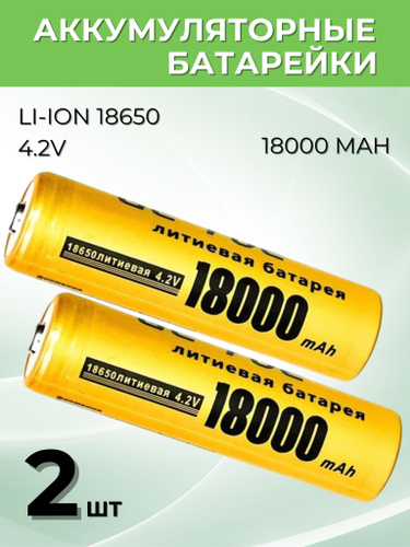 Батарейка аккумуляторная 18650 4.2V 18000mAh 2шт, аккумулятор литий-ионный (Li-ion) с выпуклым плюсовым контактом. Для налобного фонаря, шуруповерта, триммера, универсальный.