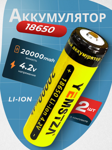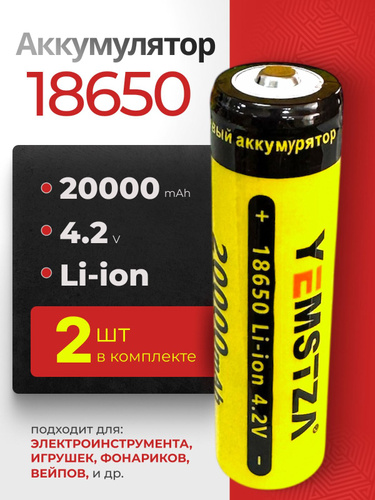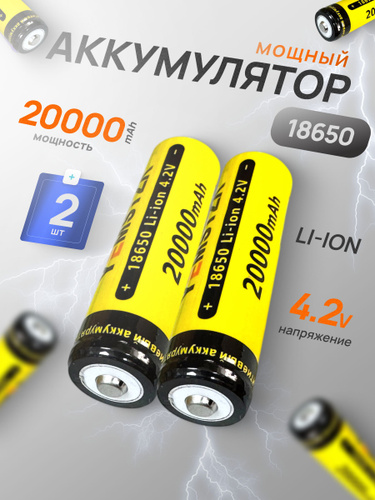 Батарейка аккумуляторная 18650 4.2V 20000mAh 2 шт, аккумулятор литий-ионный (Li-ion) с выпуклым плюсовым контактом. Для налобного фонаря, шуруповерта, триммера, универсальный.