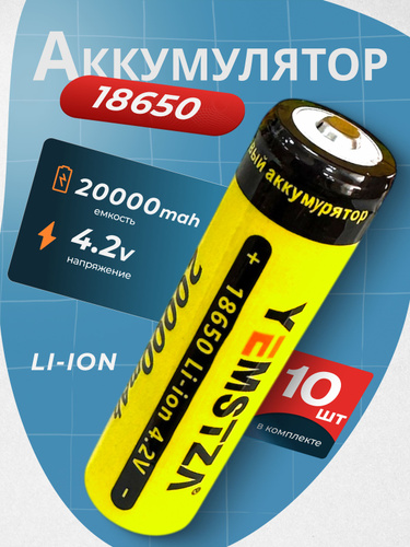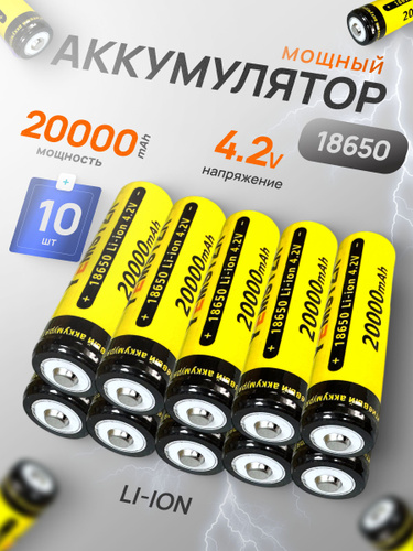 Батарейка аккумуляторная 18650 4.2V 20000mAh 10 шт, аккумулятор литий-ионный (Li-ion) с выпуклым плюсовым контактом. Для налобного фонаря, шуруповерта, триммера, универсальный.