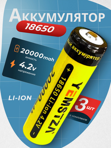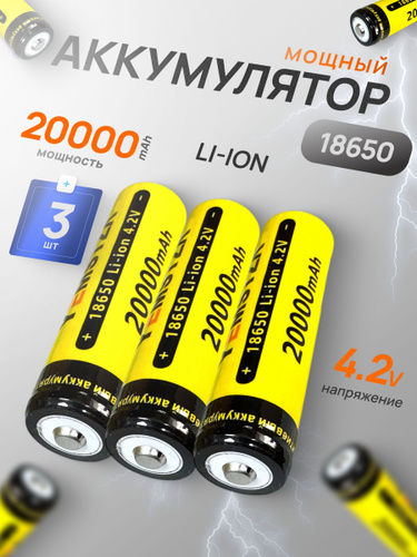 Батарейка аккумуляторная 18650 4.2V 20000mAh 3 шт, аккумулятор литий-ионный (Li-ion) с выпуклым плюсовым контактом. Для налобного фонаря, шуруповерта, триммера, универсальный.