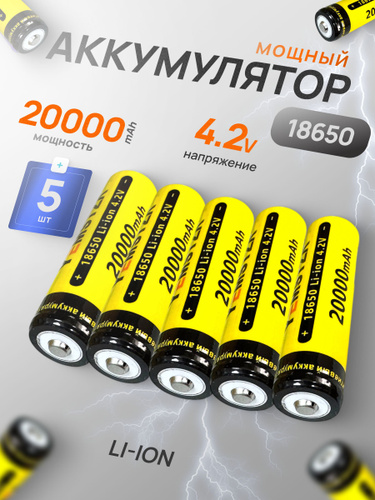 Батарейка аккумуляторная 18650 4.2V 20000mAh 5 шт, аккумулятор литий-ионный (Li-ion) с выпуклым плюсовым контактом. Для налобного фонаря, шуруповерта, триммера, универсальный.