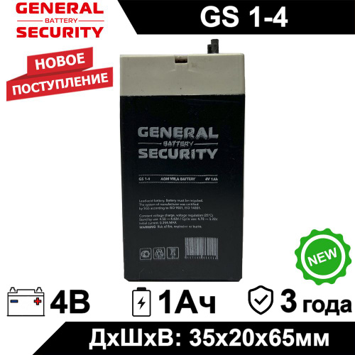 Аккумулятор General Security GS 1-4 4В 1Ач (4V 1Ah) для детского электромобиля, аварийного освещения, кассового терминала, весов, GPS оборудования, фонаря, контрольной панели