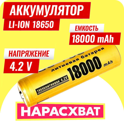 Батарейка аккумуляторная 18650 4.2V 18000mAh 1шт, аккумулятор литий-ионный (Li-ion) с выпуклым плюсовым контактом. Для налобного фонаря, шуруповерта, триммера, универсальный.