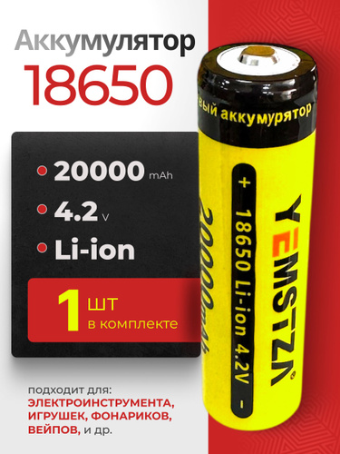 Батарейка аккумуляторная 18650 4.2V 20000mAh 1 шт, аккумулятор литий-ионный (Li-ion) с выпуклым плюсовым контактом. Для налобного фонаря, шуруповерта, триммера, универсальный.