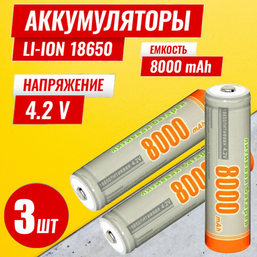 Батарейка аккумуляторная 18650 4.2V 8000mAh 3шт, аккумулятор литий-ионный (Li-ion) с выпуклым плюсовым контактом. Для налобного фонаря , шуруповерта, триммера, универсальный.