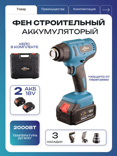 Фен строительный аккумуляторный 18V (2 акб, t до 600 , 3 насадки) "BEEZMOTO"