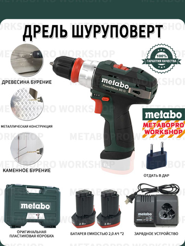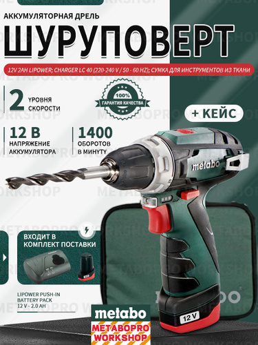 Аккумуляторная дрель-шуруповерт Metabo PowerMaxx BS Basic 12V 2.0Ah Электроинструменты 34 Nm, 0-360/1400 об/мин совершенно новый Сумка для шуруповерта
