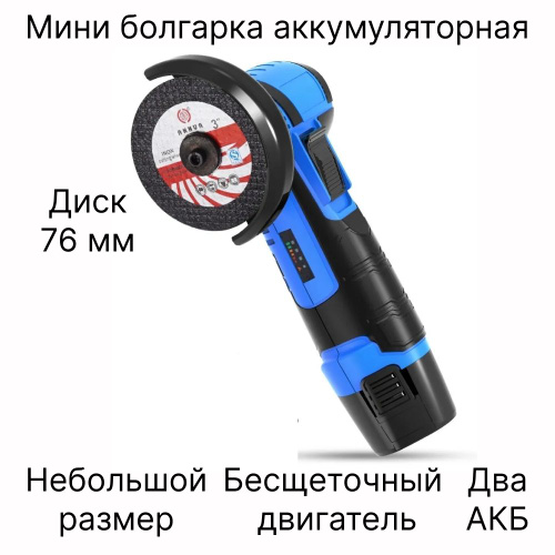 Мини Болгарка УШМ диск 76 мм аккумуляторная 12V бесщеточная с 2 АКБ, ЗУ, плавный пуск