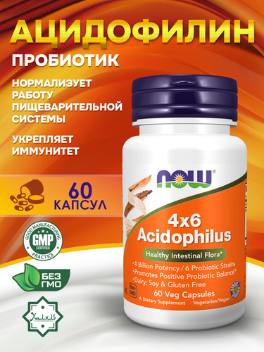 NOW Foods, 4x6 Acidophilus, Ацидофилин 4х6, 60 капсул