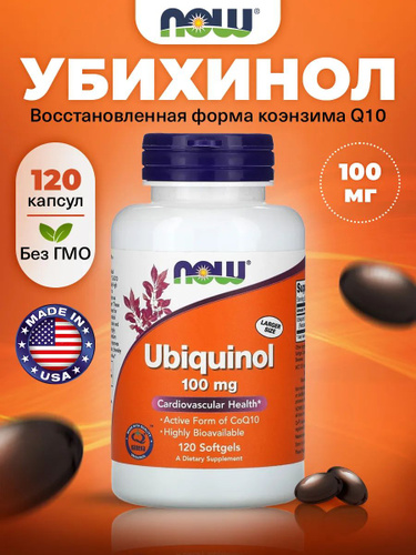 NOW Ubiquinol 100mg, Убихинол, Коэнзим Q10, 120 капсул, Антиоксидант, для сердца и сосудов, для мозга, для иммунитета взрослым