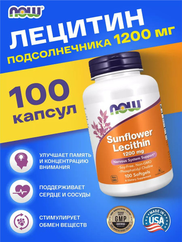 Подсолнечный Лецитин 1200 мг 100 капсул NOW Здоровье мозга и нервной системы, Для сердца и сосудов, Улучшение памяти Sunflower Lecithin