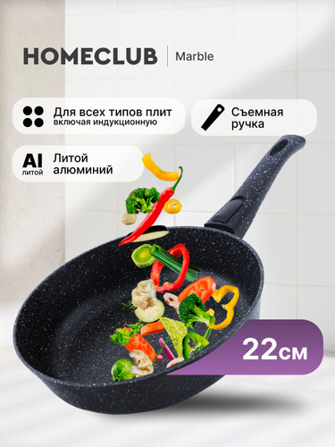 Сковорода антипригарная литая со съемной ручкой HOMECLUB Marble 22 см / Сковородка для всех типов плит, включая индукционную