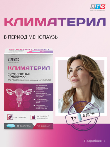 КЛИМАТЕРИЛ. Комплекс витаминов для женщин. Экстракт Витекса священного, магний, витамины группы B. При климаксе. Фитоэстрогены. 30 таблеток. ВТФ.