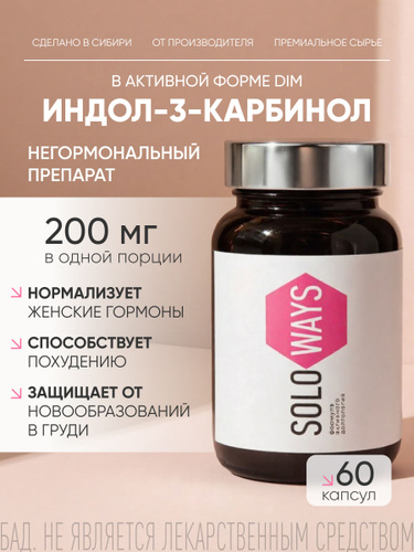 DIM эстрогены для женщин, индол 200 мг, витамины для женщин, дииндолилметан, для нормализации цикла, пмс, от менопаузы и климакса SOLOWAYS, 60 капсул.