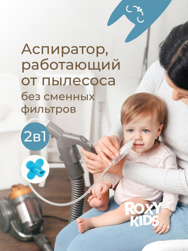 ROXY-KIDS Аспиратор назальный детский 2 в 1 Dr. BUNNY с насадкой на пылесос / Соплеотсос для детей и новорожденных младенцев 0+ с мягким наконечником, голубой мундштук