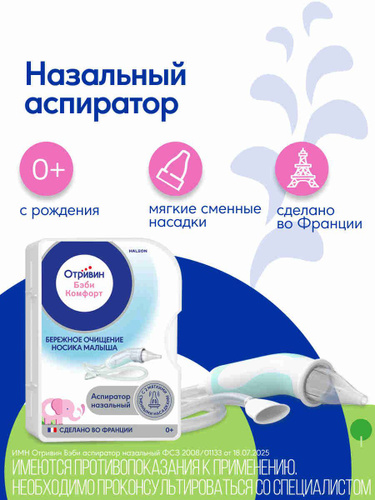Отривин Бэби Комфорт аспиратор назальный детский со сменными экстрамягкими одноразовыми насадками для детей с рождения для бережного удаления выделений из носа при насморке, 1 шт + 2 сменные насадки.