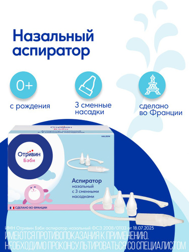 Отривин Бэби аспиратор назальный детский со сменными одноразовыми насадками для детей с рождения для удаления выделений из носа при насморке, 1 шт + 3 сменные насадки.