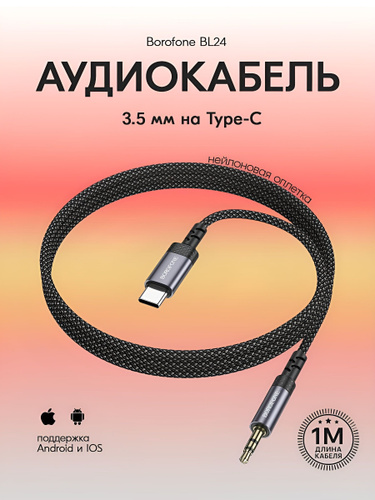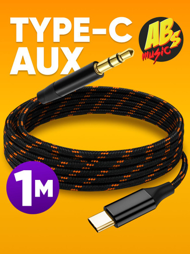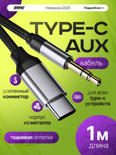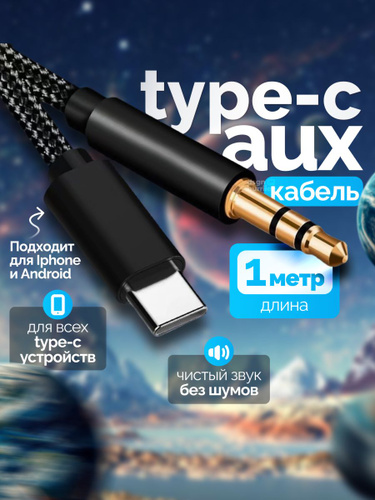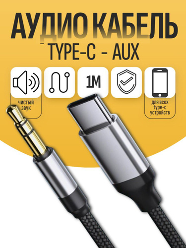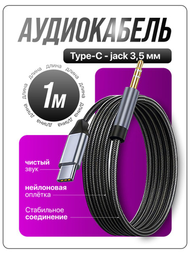 Аудио кабель AUX 3,5 - Type-C для Android, iPhone аукс в машину для смартфона, 1м. черный, плетеный
