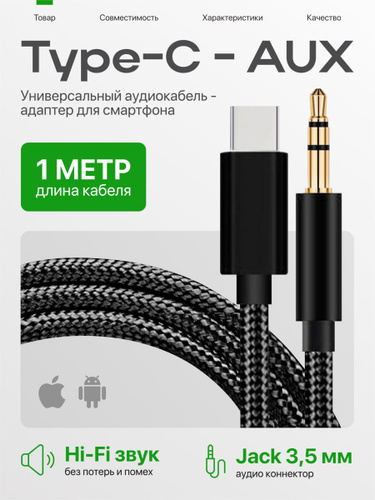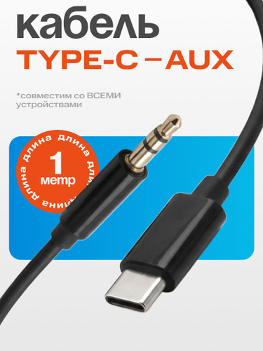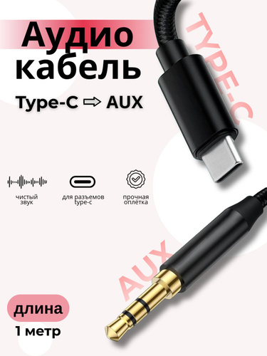 Aux ( аукс ) кабель переходник в машину шнур type c ( тайп си ) jack 3,5 для авто наушников Android . 1 метр , черный цвет