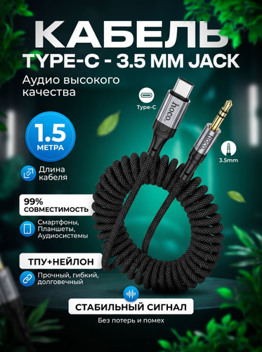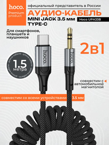 Кабель витой AUX 3.5мм - Type-C hoco UPA33B / длина 0.3 - 1.5 м / пружинный аудиокабель