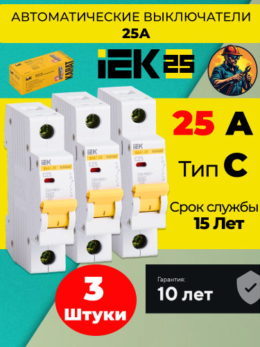 Автоматический выключатель IEK 25А 1Р 4,5кА Тип С ВА47-29 (3 штуки) (EH)