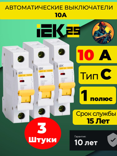 Автоматический выключатель IEK 10А 1Р 4,5кА Тип С ВА47-29. (3 штуки) (EH)