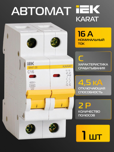Автоматический выключатель IEK 16А 2P 4,5кА тип С, 1шт, автомат ВА47-29 KARAT двухполюсный