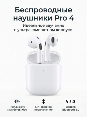 Беспроводные наушники Pro 4 TWS Bluetooth 5.0, сенсорные, с микрофоном, кейс зарядный, для iPhone и Android, гарнитура, вкладыши, стерео звук, Hands-free, белые