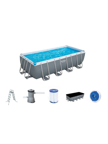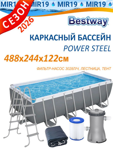 Каркасный бассейн 488х244х122 см Bestway Power Steel + фильтр-насос, тент, лестница, прямоугольный 56670