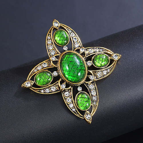 Брошь в ретро стиле в виде полого креста с изумрудными камнями