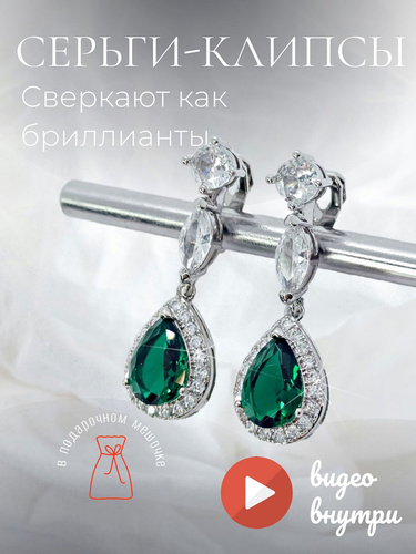 Серьги-клипсы женские Капля с фианитами, в подарочном мешочке, цвет: серебристый, изумрудный