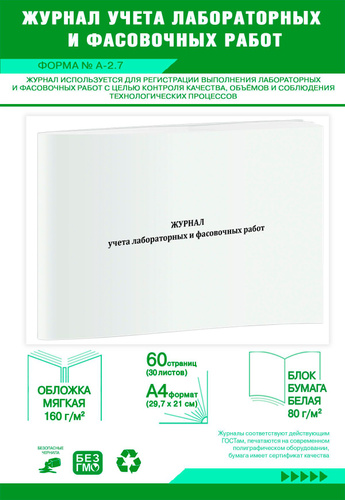 Журнал учета лабораторных и фасовочных работ (Форма № А-2.7). 60 страниц