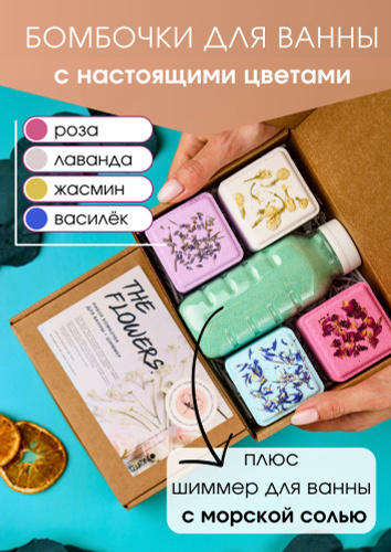 СПА набор. Шиммер для ванны и большие бомбочки с цветами: роза, лаванда, жасмин, василек.