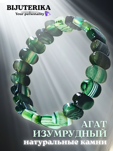 BIJUTERIKA Браслет Агат изумрудный из натуральных камней 14Х8Х5мм овал мелкий / размер 16-18, на резинке на руку / Женская и мужская бижутерия. Подарочная упаковка.
