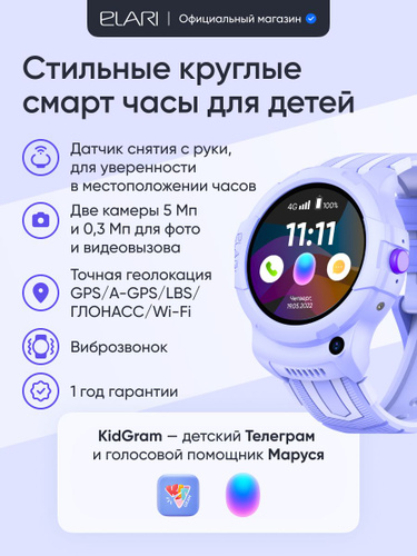 Умные смарт часы для детей ELARI 4G Wink c KidGram и Марусей, GPS, аудио- и видеозвонками, датчиком снятия с руки, лиловый