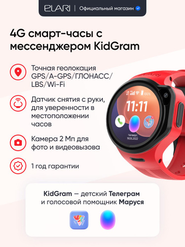 ELARI Cмарт часы детские KidPhone 4GR M c GPS трекером, прослушка, видео и аудио звонки, белый список контактов, датчик снятия с руки, Маруся, KidGram, магнитный кабель зарядки, цвет красный