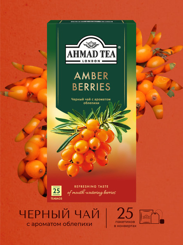 Чай "Ahmad Tea", Чай Amber Berries/Янтарные Ягоды, с ароматом облепихи, черный, в пакетиках с ярлычками, в индивидуальных конвертах, 25х1,8г