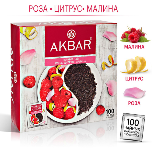 Akbar Роза, Цитрус и Малина чай черный в пакетиках, 100 пак.