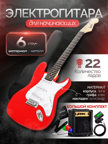 Электрогитара для начинающих Set de Guitare, красная, 6 струн, комбоусилитель 10 Вт, тканевый кейс и тюнер в комплекте