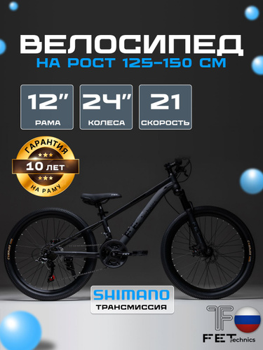 Велосипед подростковый горный 24", FET technics Sonar, черный матовый, Shimano, дисковые тормоза