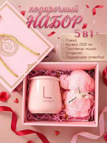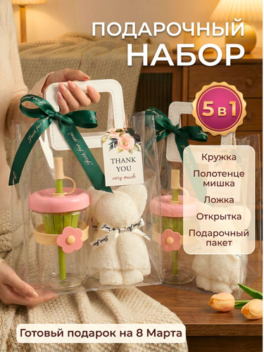 Подарочный набор для женщин на 8 марта, подруге на день рождения: кружка с крышкой и ложкой, полотенце мишка, открытка. Подарочный набор для женщин: маме, сестре, бабушке, коллеге, тете.